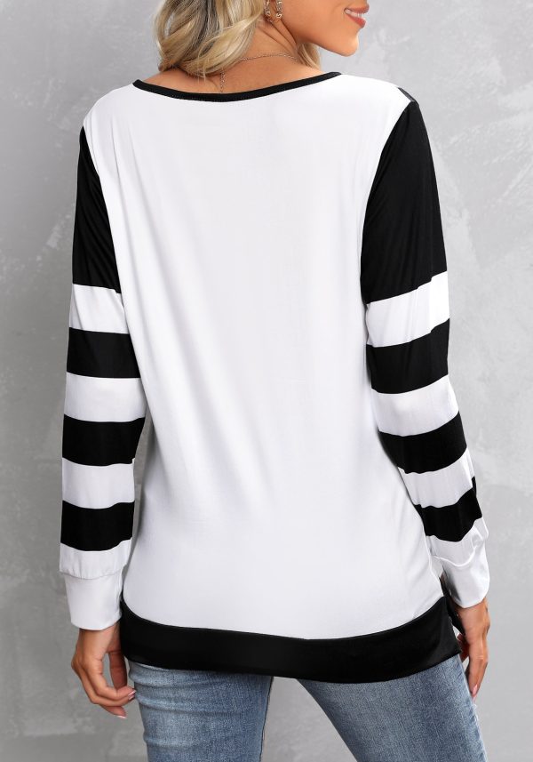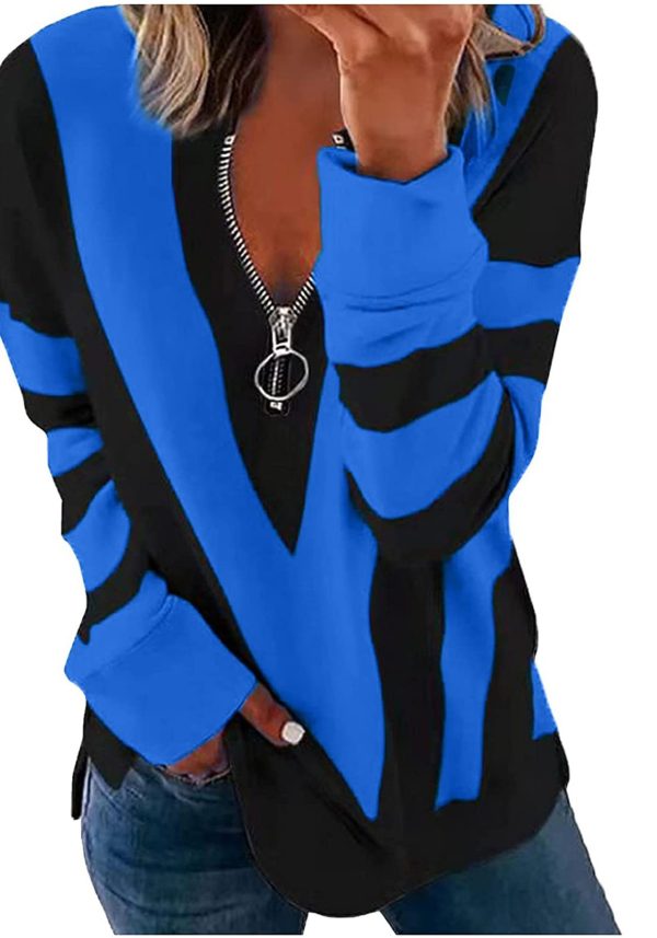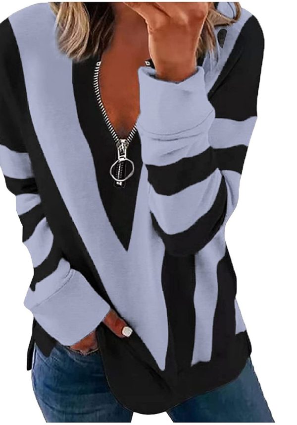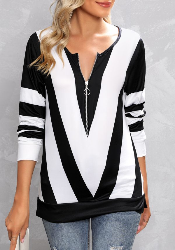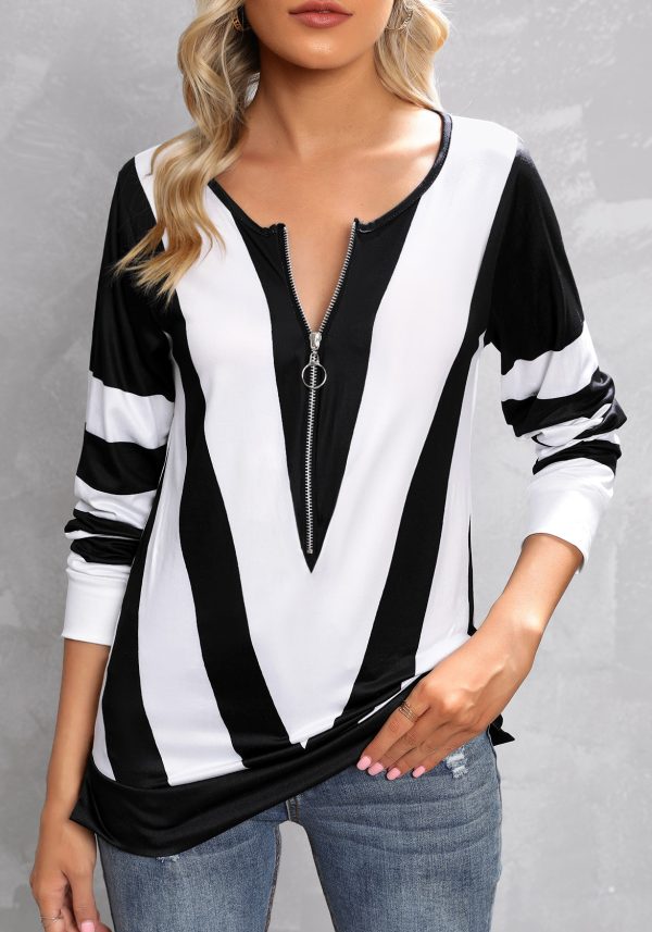 Elegant chest zipper V-stripe print long-sleeve T-shirt