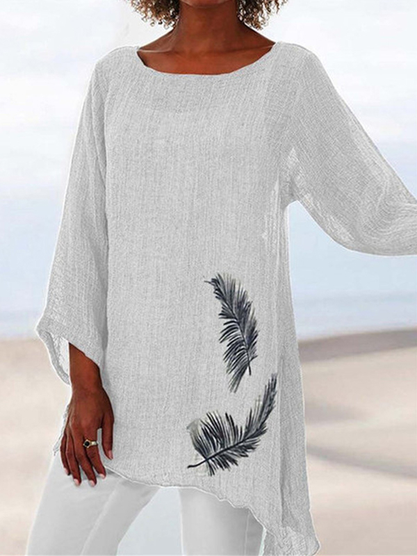 Feather Print Crew Neck Long Sleeve Pullover T-Shirt Top