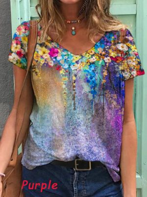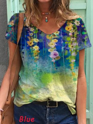 Ladies V-neck small floral gradient short-sleeved T-shirt