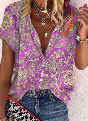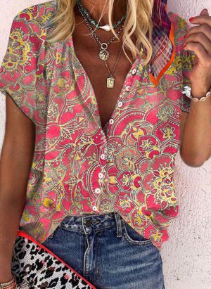 Stand Collar Single Breasted Geometric Print Loose Short Sleeve Shirt T-Shirt