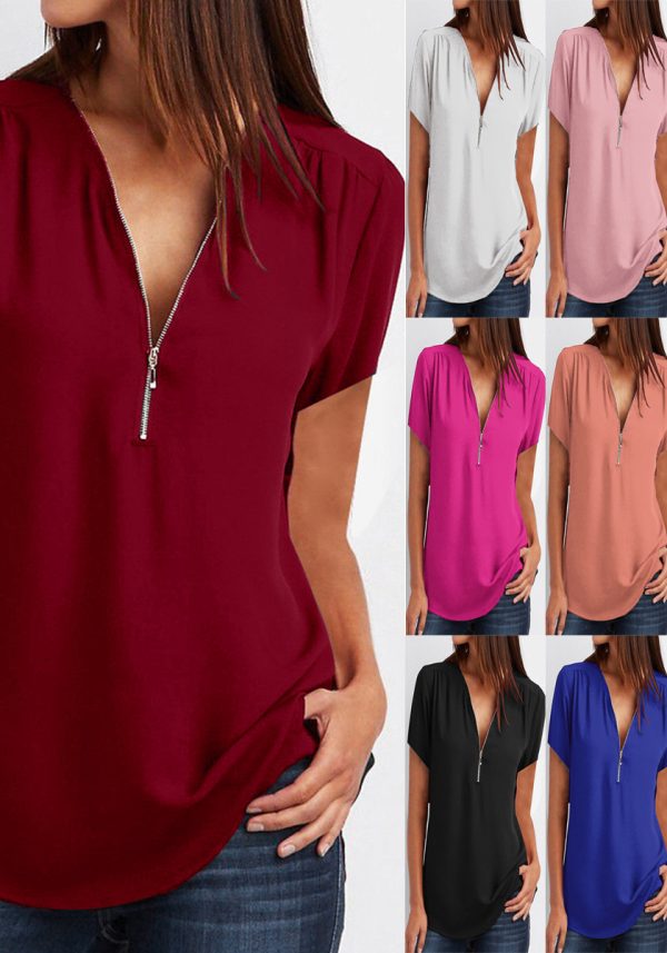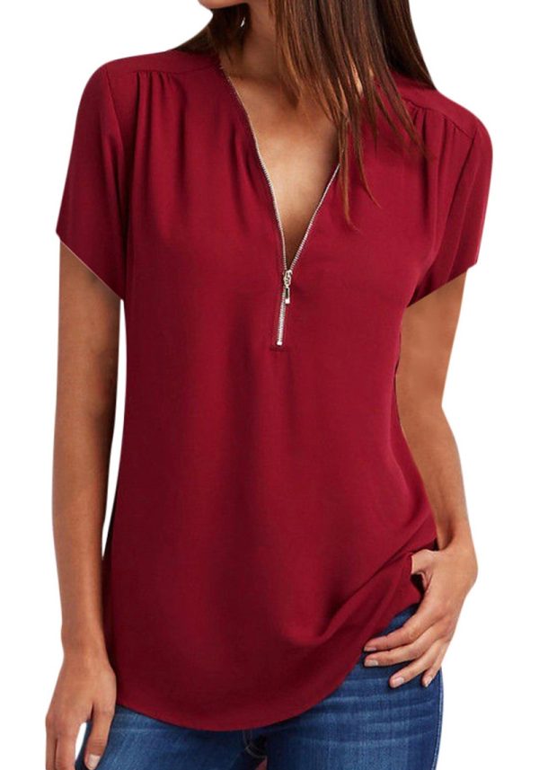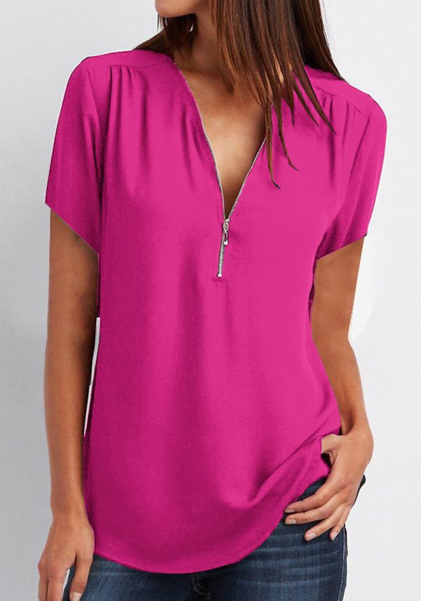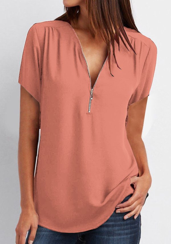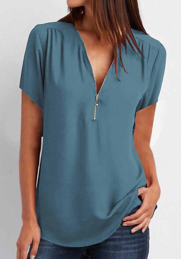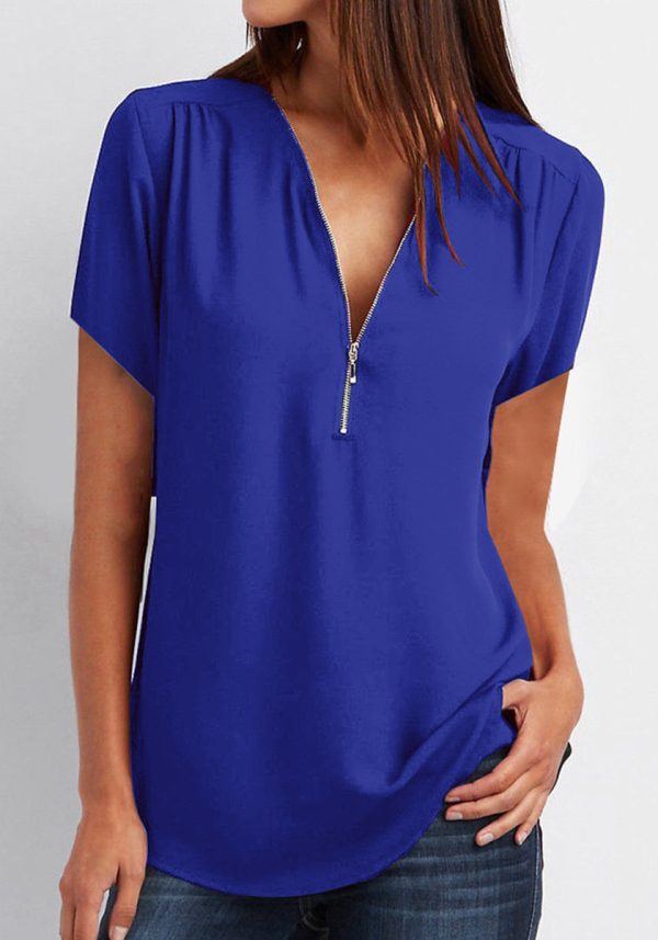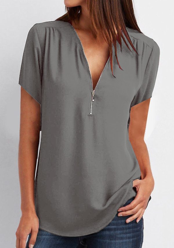 V-Neck Zip Plus Size Women’s Short Sleeve Loose Chiffon Shirt